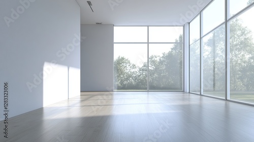 Obraz premium Empty room with large glass windows and parquet floors
