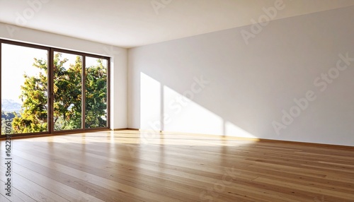 Obraz premium Empty Room with Large Window and Hardwood Floor, Sunlight Streaming In, Nature View