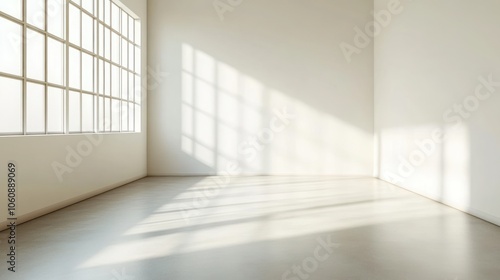 Obraz premium Empty room with large window and sunbeams streaming through.