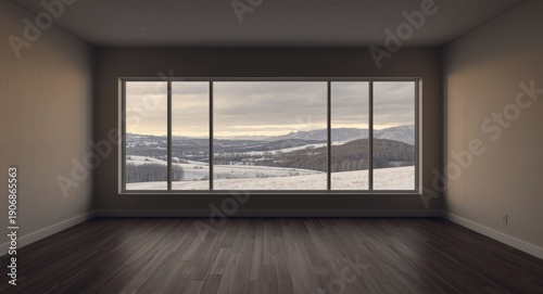Obraz premium Empty room with large window exposing tranquil snow covered landscape