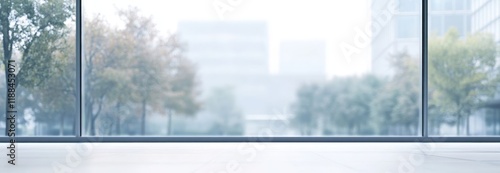 © adri, Fototapeta premium Empty room with large window overlooking city trees and buildings.