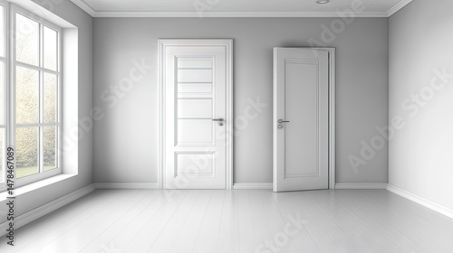 Fototapeta premium Empty room with two white doors and a large window.
