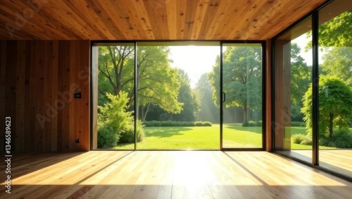 Fototapeta premium empty room with window, Sunbeams illuminate the empty room with wooden floors and large windows overlooking the beautiful green garden.