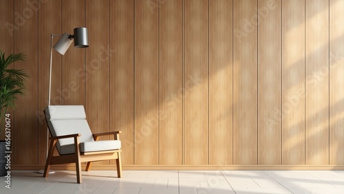 © super, Obraz premium Empty room with wooden wall paneling and a single armchair.