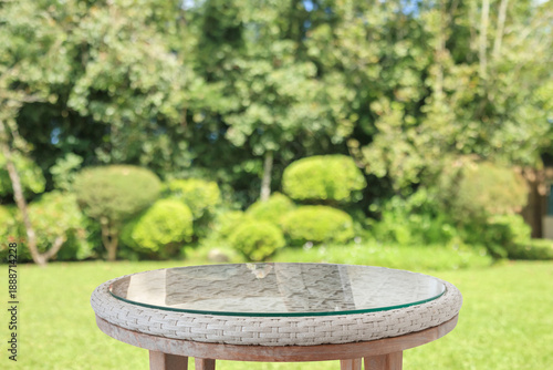 Obraz premium Empty round glass table top with abstract blur green park garden background