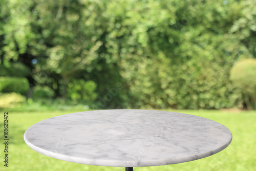 © Kwangmoozaa, Naklejka premium Empty round marble table top with abstract blur green park garden background