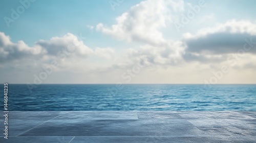 © MDAFSHAR, Obraz premium Empty round stone table top on sea background. Mock up,