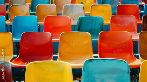 Fototapeta premium Empty rows of colorful stadium seats, outdoor public theatre concert hall...