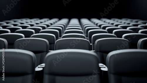 © Gibster, Naklejka premium Empty rows of sleek black theater seats in a dimly lit space.
