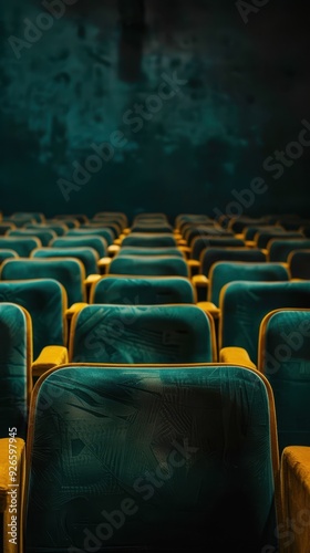 © umut hasanoglu, Fototapeta premium Empty rows of teal seats in a dimly lit movie theater create a nostalgic yet eerie atmosphere.