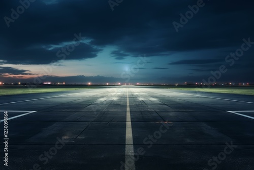 © juliars, Fototapeta premium Empty runway illuminated at night under dramatic sky