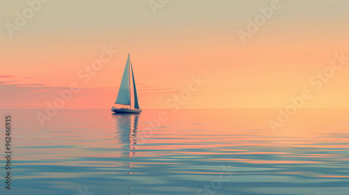 © Aleena, Fototapeta premium empty sailboat on calm waters, against the backdrop of dusk's gradient sky, A pastel color palette with muted blues for the sea and twilight hues