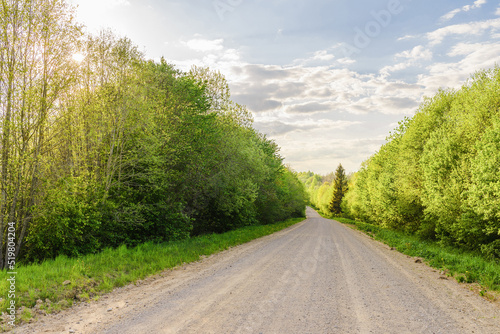 © ARVD73, Fototapeta premium Empty Sandy country road near the forest,fluffy clouds blue sky,summer evening landscape.