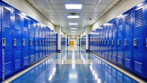 Fototapeta premium Empty school hallway with royal blue metal lockers, empty lockers