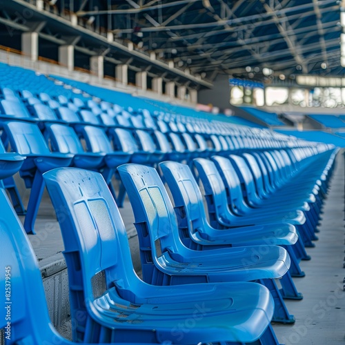 Fototapeta premium Empty seats at the stadium. Blue plastic seats in a stadium without spectators or fans