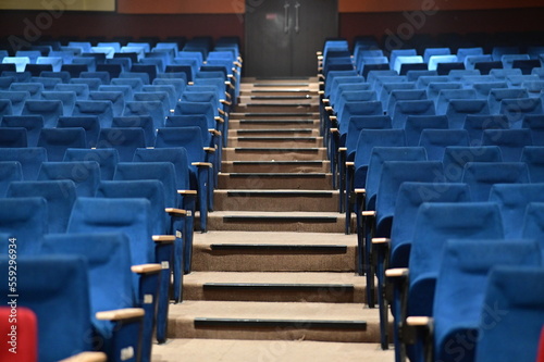 Naklejka premium empty seats in a concert drama hall. Red and Blue Chairs. Empty conсert hall...