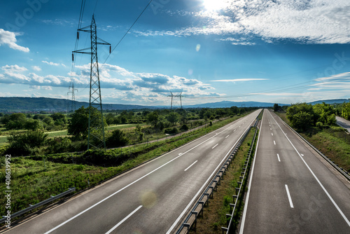 © Ivan, Fototapeta premium Empty silent Asphalt highway road with beautiful sky and a row of electricity pylons