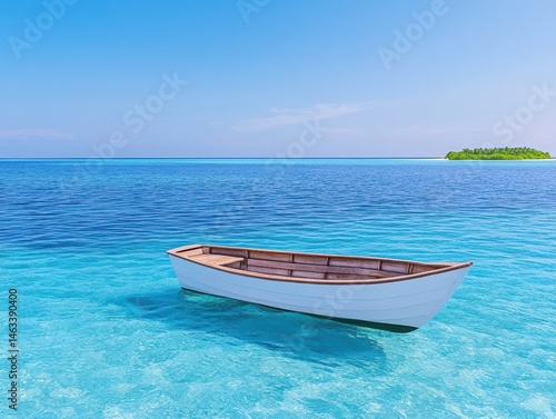© darion, Naklejka premium Empty small boat on calm tropical ocean
