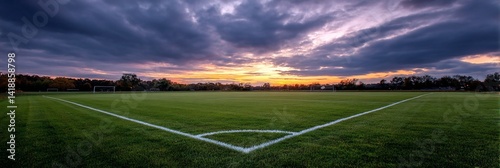 © Khamidhilal, Obraz premium Empty soccer field at sunset
