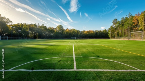 Obraz premium Empty soccer field with crisp white lines.