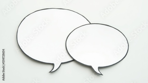 © Seyyar, Fototapeta premium 2 empty speech bubbles on a white paper background. Chat bubbles made from cardboard. Simple and effective design. Concept of discussion and commenting with ample free empty space for text.