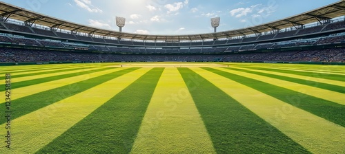 Fototapeta premium Empty Sports Stadium With Green Grass Field And White Lines During Daytime,...