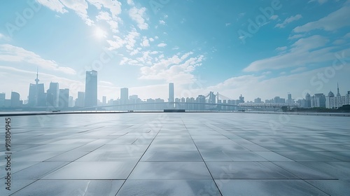 © Generative AI, Fototapeta premium Empty square floor and bridge with city skyline under blue sky : Generative AI
