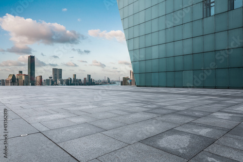 © ABCDstock, Fototapeta premium Empty square floor and city skyline with buildings in Shanghai at sunset, China.