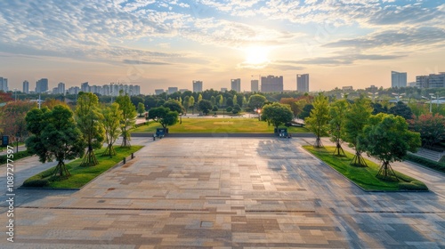 © ArpPSIqee, Fototapeta premium Empty square floor with city skyline background, Cityscape in abstract perspective, urban scene transformed into geometric art