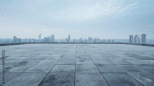 Fototapeta premium Empty square floor with city skyline background, Cityscape with architectural...