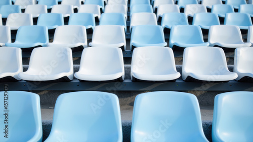 Fototapeta premium Empty stadium seats create serene atmosphere, showcasing modern design with blue and white colors