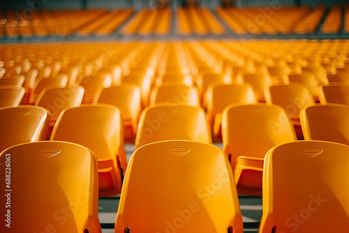 Fototapeta premium Empty stadium seats of a running court seen from the opposite side, frontal view
