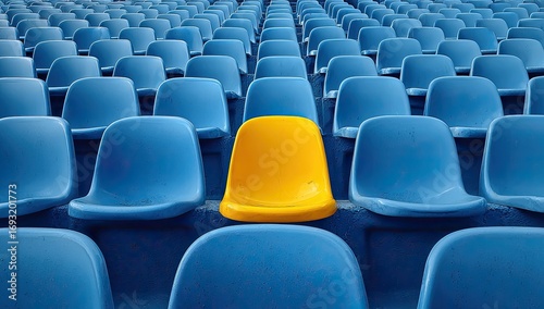 © baskara, Fototapeta premium Empty stadium seats, one yellow