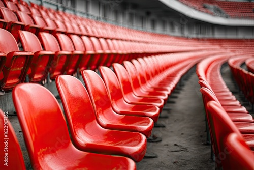 © Takalar, Fototapeta premium Empty stadium seats, red plastic, curved rows