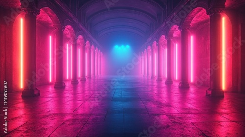 © zong, Obraz premium Empty stage with vibrant neon pink and blue lighting beams spotlight smoke futuristic cyberpunk concert event atmosphere
