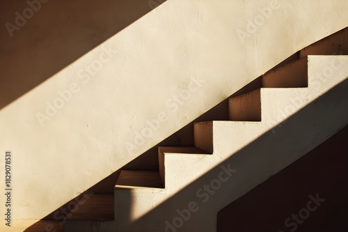 © Sekai, Fototapeta premium Empty staircase with sharp geometric shadows creating minimalist composition focused on simplicity and architectural purity