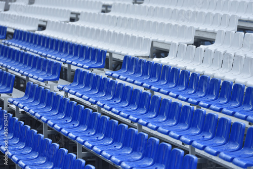 Fototapeta premium Empty stands with wet seats in red, white and blue in the stadium after the rain