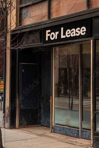 Obraz premium Empty storefront with "For Lease" text sign, reflecting economic downturn and...