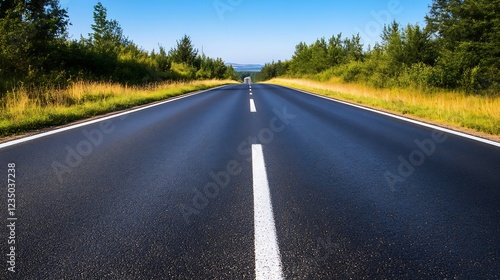 © Generative AI, Fototapeta premium Empty Straight Asphalt Road Through Countryside Surrounded by Lush Trees : Generative AI