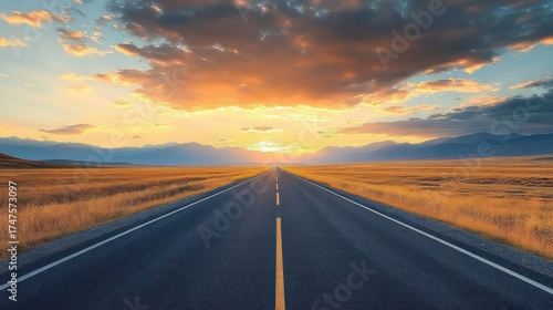 © Hal, Fototapeta premium Empty straight highway stretching into the horizon with golden fields on both sides and mountains under a dramatic sunrise sky with scattered clouds