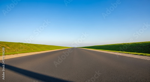 © Celt Studio, Naklejka premium Empty straight road disappearing into horizon with green grass on sides for concept of journey, future, freedom, and life path