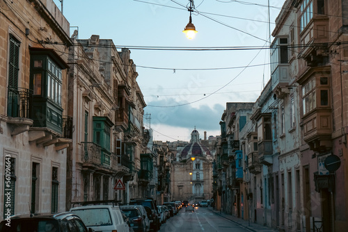 © Lucky Ev, Fototapeta premium Empty street in Malta with typical balconies and architecture and a church