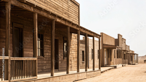 © Tin, Obraz premium Empty street in old wild west wooden town concept. Desert town with rustic wooden buildings and empty streets.