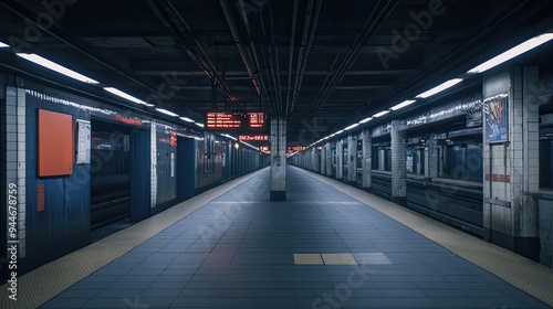© Ariestia, Obraz premium Empty Subway Platform with Red Sign and Tiles