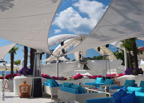© haidamac, Obraz premium Empty summer beach cafe with white parasols and blue sofas