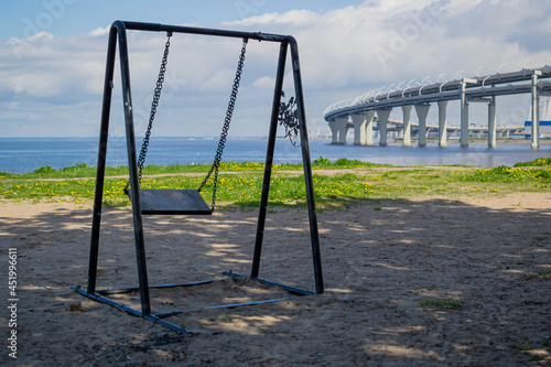 Fototapeta premium Empty swing swayed by the wind in shade of trees on the coastline seashore near of a big rounded Controlled-access motorway highway bridge, the road passing over the sea bay coast