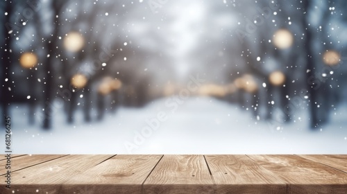 Naklejka premium Empty table in beautiful winter landscape, wood plank board in snow mountain outdoor comeliness