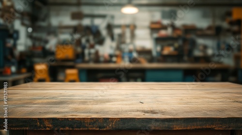 © Jane Kelly, Obraz premium Empty table top. Blurred workshop interior background