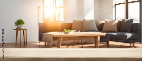 Fototapeta premium Empty table with abstract blurred background. blur living room. for product...