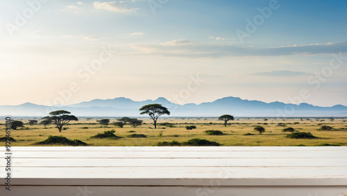 © adynue, Fototapeta premium Empty the top of white wooden table for produst display with blurred a landscape african wildlife background
